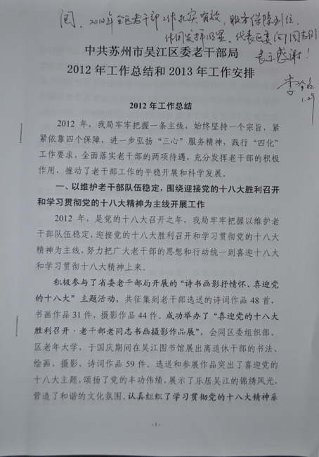 近日,吴江区委常委、组织部部长李铭对2012年度全区老干部工作表示高度肯定,在《中共苏州市吴江区委老干部局2012年工作总结和2013年工作安排》上批示:2012年全区老干部工作扎实有效,服务保障到位,作用发挥明显。代表区委向同志们表示感谢!