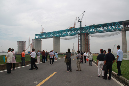 9月7日上午,张家港市老干部书画协会一行20余人赴沪通铁路长江大桥采风。张家港市交通局和工程方工作人员向老同志介绍了沪通长江大桥的基本情况。在实地参观施工现场后,老同志纷纷表示大桥的规模之大、科技含量之高令人十分震撼,对家乡面貌的巨变感到无比自豪。回去以后,将把此次采风活动的灵感融入到艺术创作中,用书法绘画的方式表达出内心的喜悦,为迎接党的十九大胜利召开添墨加彩。