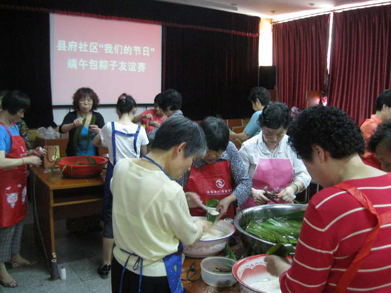 2013年6月6日下午,太仓市县府社区和辖区单位联合举办了“我们的节日”迎端午包粽子比赛,社区居民、辖区单位、社区工作人员30余人参加了此次活动。参加活动的选手们个个都有一双巧手,包粽子既快又好,几乎不分胜负,没一会儿,粽子就装了满满几盆。