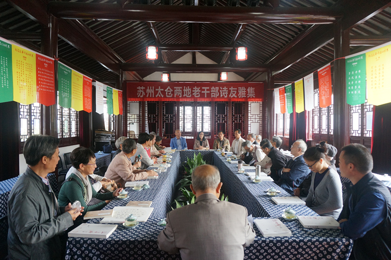 10月18日上午,太仓市沧江诗社内济济一堂喜气洋洋。10位苏州老干部诗词协会的成员与10位太仓诗词协会成员在此举行诗友雅集,以此纪念改革开放40周年和周恩来诞辰120周年。