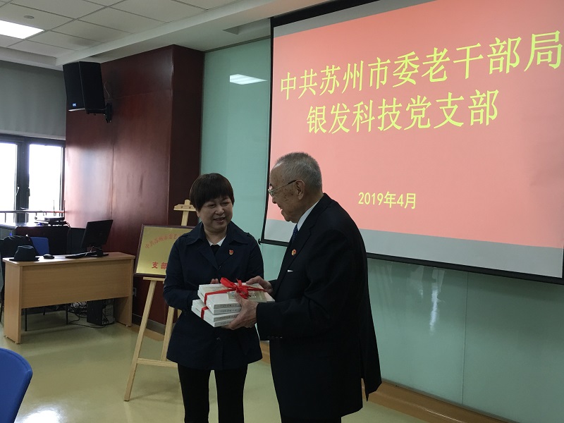 党日活动分为三个阶段:一是赠送学习资料。陈燕颜同志向支部赠送学习资料《习近平用典》和《中共苏州独立支部的成立》宣传册。二是探讨党建模式。陈燕颜同志对银发科技支部近年来开展的自我学习、自我教育、自我管理、自我服务等活动给予了高度评价。她说:今天是来学习传统的。银发科技支部是一个“特殊”的支部,年龄高、级别高、热情高。坚持开展的各项活动,充分体现了老党员们始终坚持“离岗不离党,退休不褪色”,永葆共产党员先进性,“听党话、跟党走”的政治本色,是我们学习的榜样。她指出:今天是来交流探讨的。银发科技支部的建立是落实中央全面从严治党要求的实践尝试,也是适应老党员“区缘型”“趣缘型”“业缘型”的现实需要,更是做好新时代离退休干部党建工作的有益探索。她表示:今天是来祝福祝愿。作为晚辈,我代表老干部局、离退休干部工委,祝各位老党员身体健康、阖家幸福,希望今后将银发科技支部活动与老干部局开展的“苏州银发先锋”“红色育才计划”等活动结合起来,共同推进苏州离退休干部党建工作创新发展,为苏州勇当“两个标杆”、建设“四个名城”、在更高起点上实现高质量发展走在最前列增添正能量,以优异成绩庆祝新中国成立70周年。三是表忠心当先锋。银发科技支部党员根据支部年度学习计划,就学习资料《习近平在正定》进行学习心得交流讨论。