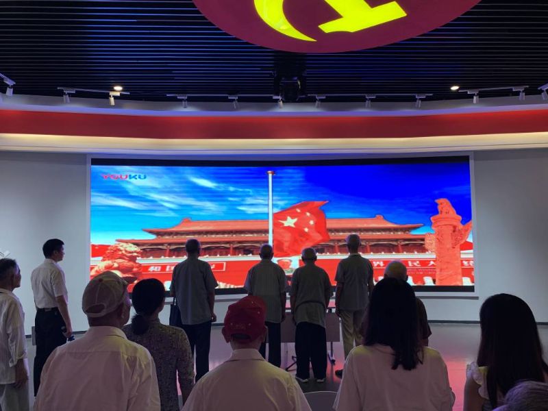 致敬祖国:邀请了3位离休干部党支部书记以及98岁高龄的“最美老干部”顾仲良同志上台,全体起立,奏国歌、升国旗。看着大屏幕里冉冉升起的国旗,老同志们眼里充满了爱与崇敬。