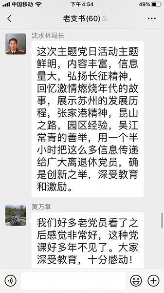 反响热烈。观看完毕,余韵激荡。老党员们都深受触动,发来一段段感悟:“这次活动主题鲜明、内容丰富、形式新颖,点赞!”“看了今天的主题党日活动,形式好,内容实,耳目一新,老党员反响强烈,犹如享受了一次精神大餐。”“这次主题党日活动主题鲜明,内容丰富,信息量大,弘扬长征精神,回忆激情燃烧年代的故事,展示苏州的发展历程,张家港精神,昆山之路,园区经验,吴江常青的善举,用一个半小时把这么多信息传递给广大离退休党员,确是创新之举,深受教育和激励。”……大家都从中受益匪浅,点燃激情,要“不忘初心,牢记使命,助力火红年代”。
