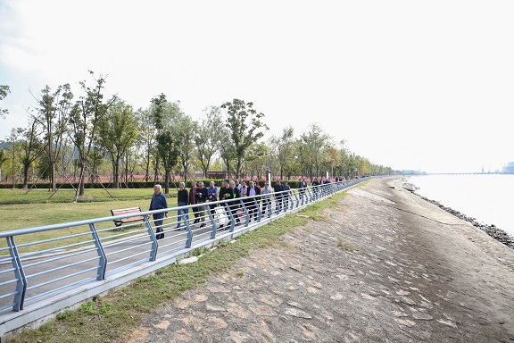 随后,大家来到南通市滨江体育公园参观。老党员们认真观看了公园中“落实长江大保护重要指示 实施五山及沿江生态修复”的展板,详细了解南通市五山及沿江地区生态修复的有关工作,欣赏着沿江生态修复后滨江体育公园及龙爪岩滨江风光带的怡人风景。在这样秋高气爽、阳光明媚的好天气里,大家走着、看着、聊着、笑着,一边交流退休后的幸福生活,一边用相机“咔嚓”定格住美丽的风景。