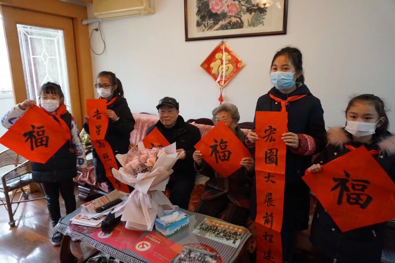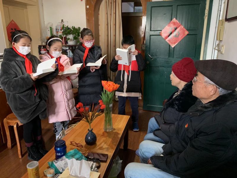 朗朗读书声,喜迎幸福年。8名红领巾小志愿者同社区工作人员一同前往老干部家中,为他们送上新年美好祝福。孩子们精心准备了《习近平谈治国理政》第三卷节选为老干部老党员诵读,孩子们抑扬顿挫、情感饱满的朗读了《全面把握中国特色社会主义进入新时代的新要求》,稚嫩而纯净的声音让老干部们忍俊不禁,家中欢声笑语洋溢。孩子们还为老干部们送上了春联和福字,祝福爷爷奶奶们新年快乐,身体健康。