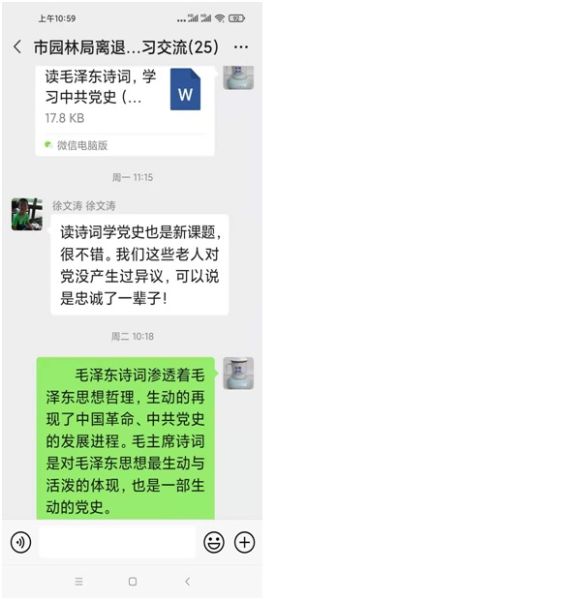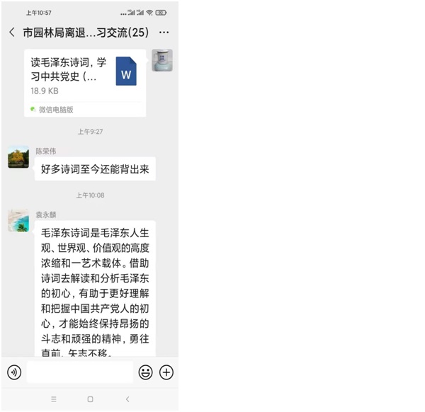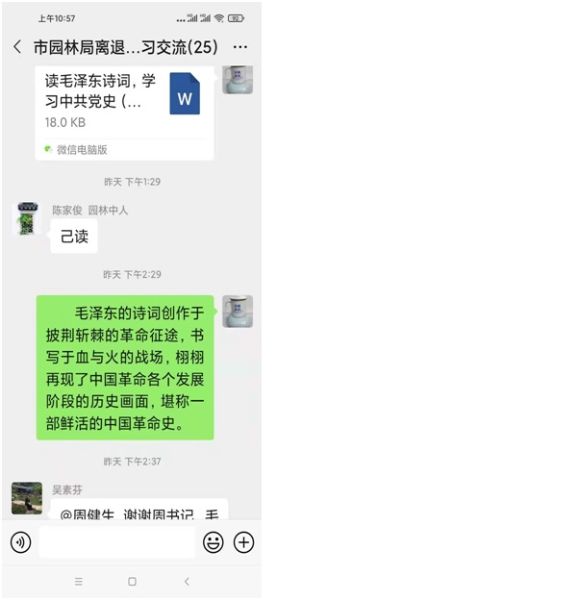 党支部以新民主主义革命时期毛泽东诗词为切入点,汇集了毛泽东从1925年12月至1949年4月期间公开发表的《沁园春•长沙》《七律•长征》《七律•人民解放军占领南京》等16首有代表的诗词,通过“党员学习交流微信群”日均推送2首。为便于大家学透悟深,每首诗词配有详细的注释、详实党史知识和独到见解的解读,让大家重回那个血与希望交织的年代,感悟共产党人不畏艰难险阻、乘风破浪勇夺胜利的坚定信念,深刻理解毛泽东思想所带给我们的宝贵精神财富。