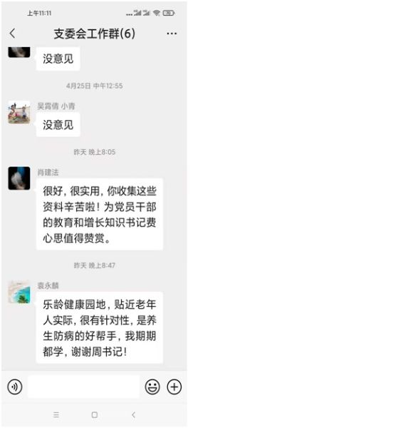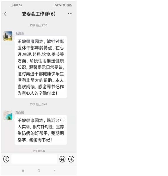 开展党史学习教育以来,支委会以学促做,精准掌握老同志的实际需求,坚持从实际出发,尽力而为、量力而行,从3月初,通过官方和专业信息平台汇集精编健康生活知识,依托“党员学习交流微信群”每周为老同志推送一期“乐龄健康”贴士,提供共享教育资源。栏目内容,围绕常态化疫情防控、营养膳食、运动健身、心理健康、伤害预防、疾病预防、合理用药、康复护理、生命教育、中医养生保健等10多个方面,宣传老年人健康知识,宣传医养结合等老年健康服务模式,增强自我保健意识和健康管理能力。