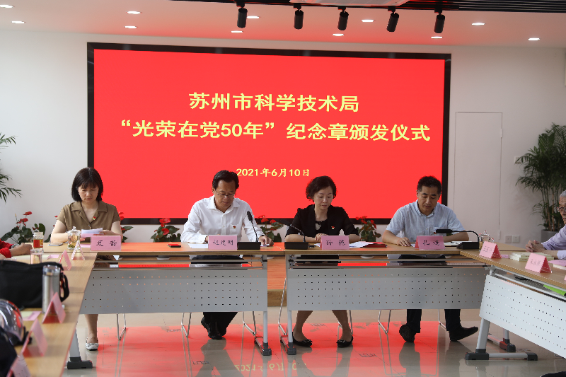 6月10日上午,市科技局举行“光荣在党50年”纪念章颁发仪式,向10名党龄达到50周年、表现良好的党员代表颁发纪念章。局党组书记赵建明为老同志颁发纪念章并讲话,副局长、机关党委书记孙艳主持活动。