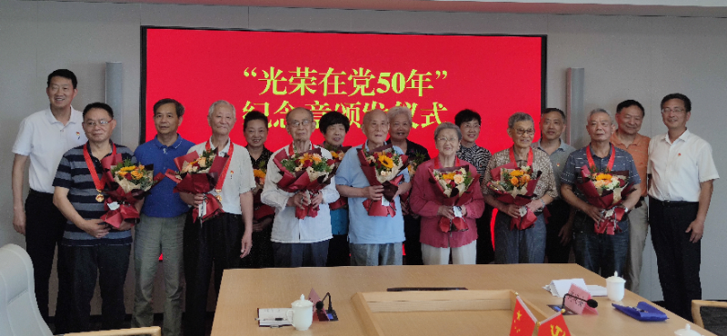 在随后召开的座谈会上,91岁高龄73年党龄的老党员陈浩同志激动的唱起了《大海航行靠舵手》。94岁高龄71年党龄的老党员薛月楠同志寄语在职党员和离退休党员。最后,吴菊铮书记亲自为工委7位老党员颁发了“光荣在党50年”纪念章并送上鲜花。
