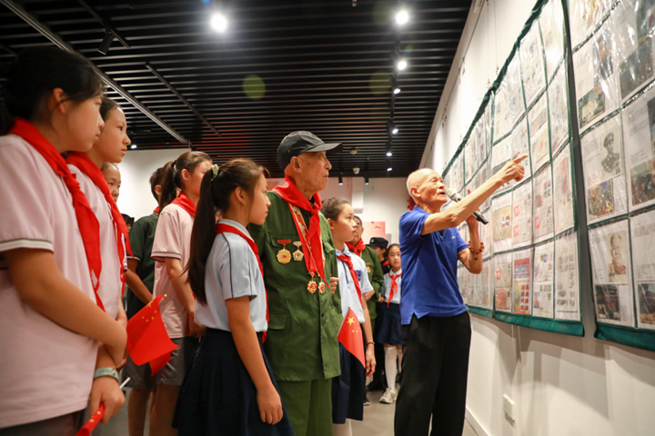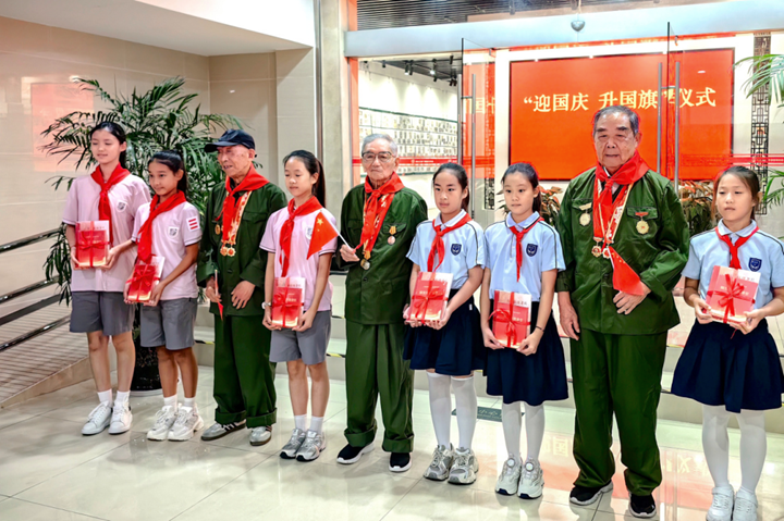 活动伊始,市老干部艺术团以激昂的朗诵合唱暖场预热,营造出浓厚的爱国氛围。现场特邀钱慕秋、朱根林、王哲三位90岁以上高龄的离休干部出席,新康实验小学少先队员为他们佩戴上鲜艳的红领巾,以童真之礼致敬革命前辈,完成一场跨越时空的“红色接力”。仪式中,离休干部向学生代表赠送《苏州抗战老兵口述史》及相关视频光盘,将承载着苏州抗战记忆的“鲜活教材”传递给青少年。最后,景城学校学生表演《我们的少年警梦》,展现出新时代青少年昂扬向上的精神风貌。