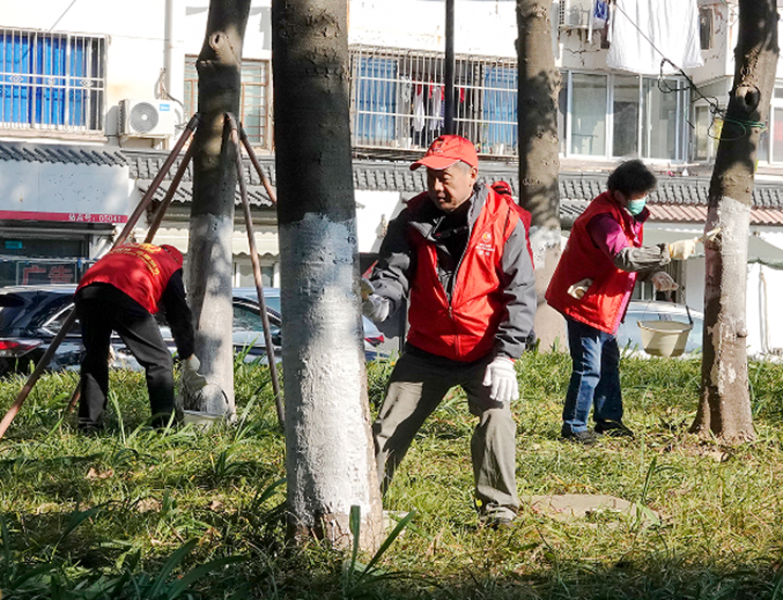 活动现场,这些经验丰富的老党员、老专家们,身着统一的志愿者服装,手持刷子、肥料盆桶等专业工具,化身为树木的“贴心守护者”。他们虽已华发,却干劲不减当年,三两结组,分工明确,配合默契。一组老同志专注地为树木“添衣保暖”,他们手持刷具,一丝不苟地将精心调配的白色防护浆均匀涂抹在树干上。这层“白衣”不仅能够有效反射部分阳光,减少树干因昼夜温差过大而导致的皮层开裂,更能防治越冬的病虫害,为树木安全越冬构筑起一道坚实的物理与生物屏障。另一组老同志则细致地为树木“加强营养”,他们手持盛装各种复合肥料的塑料灰盆,熟练地在草坪、密植绿篱和树根周围的土壤上均匀撒施,既保证了肥料能够被树木充分吸收,又避免了对根系的损伤,保障树木、绿地来年的生机与活力。