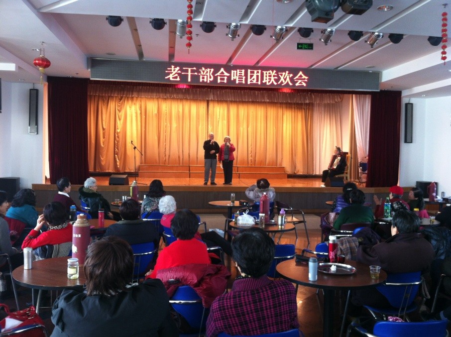 “我和你,心连心,同住地球村……You and Me,From one world,We are family。”刘欢和莎拉·布莱曼的歌声在市老干部活动中心舞厅响起,高亢的歌声,优美的旋律,让人仿佛重新回到了北京奥运会开幕式。然而唱歌的人却不是他们,而是两位离休干部。12月31日下午,市老干部合唱团在迎新年座谈会后,汇报演出火热上演。