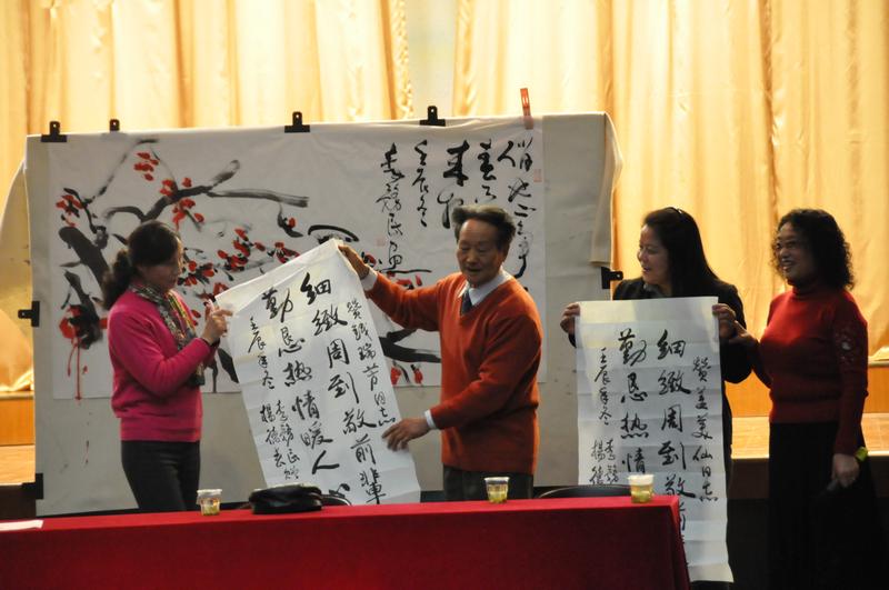 舞会开始后,老同志们纷纷亮出自己的拿手好戏,各种风格的交谊舞依次闪亮登场,令人目不暇接叹为观止。一时间老同志们在乐曲的感召下,纷纷布入舞池,八仙过海各显神通,形成了欢乐的海洋。整场舞会的最高潮莫过于李务民、杨德春两位老师带来的创新节目——在杨老师悠扬的配乐诗朗诵中,李老现场泼墨挥毫,在短短两分多钟的时间里一气呵成书写了一幅大气磅礴的《七律·长征》;紧接着又点染丹青,即兴创作了一幅《傲霜斗红梅图》。随着李老的笔走游龙,现场的观众们都情不自禁围上前来,簇拥到李老身后近距离观赏他的创作,并纷纷举起相机留下这令人赞叹的时刻。创作结束后,李老还应邀将两幅作品赠送给了现场的观众,使现场的气氛达到了顶点。随后,感人的一幕出现了,两位老同志取出了写着“细致周到敬前辈,勤恳热情暖人心”字样的书法对联,送给了活动中心的工作人员,感谢她们一直以来热情细致的服务。这样的评价既是肯定也是鼓励,既是鞭策又是希望,温暖和鼓舞着每一位为老干部工作而努力奋斗的工作人员。