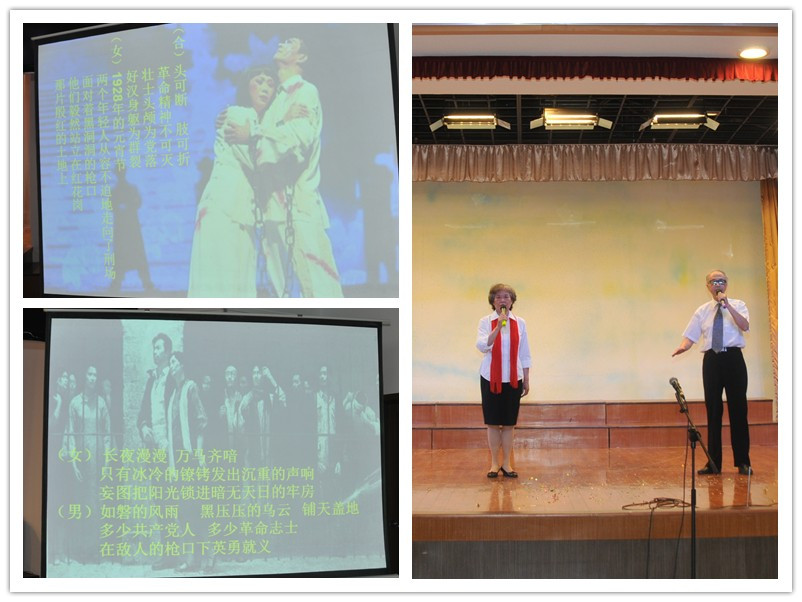 整场演出气氛热烈,演出形式多样,老同志们纷纷使出看家的本领,给现场观众带来了一场视觉和听觉的盛宴。来自苏大艺术团的诗歌朗诵更是运用到了现代的投影设备复辅助表演,为悲壮庄严的诗歌朗诵增添了更为强烈的视觉冲击。