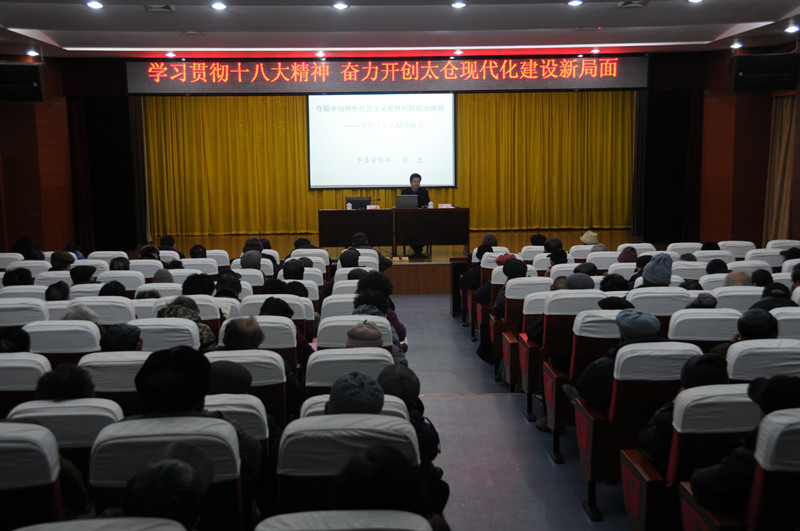 1月17日上午,太仓市委老干部局邀请太仓市委宣传部副部长张忠为全太仓市离退休干部党员作党的十八大精神解读报告。太仓市委老干部局副局长施海鹰主持报告会。全市近200名离退休干部党员参加了此次学习。