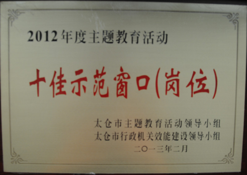 太仓市老干部活动中心不断创新服务载体,丰富服务内涵,提升服务效能,赢得了广大老干部的满意,在2012年度主题教育活动中,荣获十佳示范窗口(岗位)称号。