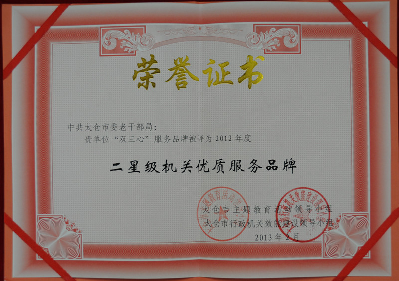 太仓市委老干部局在为老干部服务过程中,一直以“双三心”(树立敬老用真心、爱老有孝心、为老具细心的服务态度,达到老干部称心、老干部家属安心、市委市政府放心的目标)优质服务品牌精神要求自己,并不断创新思路,强化举措,有力地推动“双三心”服务品牌的提质升级。最近,“双三心”服务品牌获太仓市“二星级机关优质服务品牌”称号,成为太仓市获得此荣誉的11个服务品牌之一。