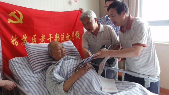 为迎接党的“七一”生日,姑苏区委老干部局充分利用“流动党校”这一平台,将党的关怀及时送到长期住院的老同志身边。6月20日,姑苏区委老干部局副局长蒋伟亮、平江活动中心离休干部一支部书记杨林和玄妙观社区党委工作人员,到九龙医院看望了长期住院的玄妙观社区老干部周骅同志,向他介绍了国内外形势、姑苏、区建设概况和支部开展活动的情况,并送去了学习材料和问候,使老干部深切感受到党组织的关怀。周骅同志感慨地说:“我虽然长期住院,不能参加支部生活,但通过‘流动党校’不忘记我,及时让我了解外面的情况,老干部‘流动党校’始终为我们着想,真好”。