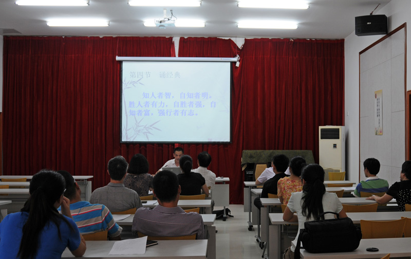 此次活动以“自我反省、唱歌曲、学模范、诵经典、劝善词、发善心、行崇德礼、送吉祥”八个环节进行,唱了一首《公民道德歌》,学习了全国孝老爱亲模范——舒新华同志的感人事迹,诵读了《道德经》中的一段名句,集体念读了《劝善词》,庄严地作了承诺,集体向“德”字鞠躬致敬。