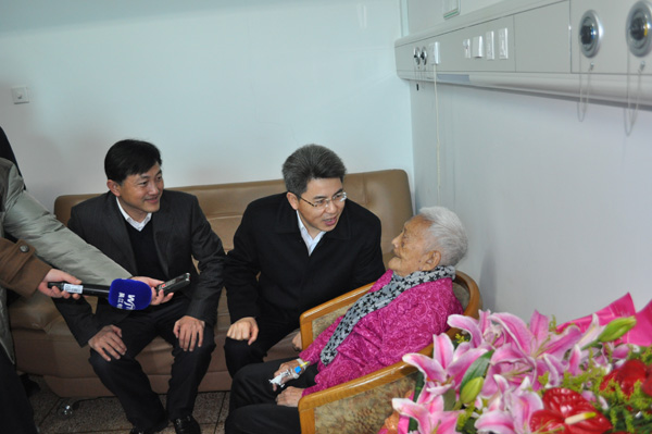 梁书记关切地询问杨晶明的身体状况和医疗情况,并嘱咐医护人员要继续精心照顾、精心治疗她的身体,让她安享幸福晚年。
